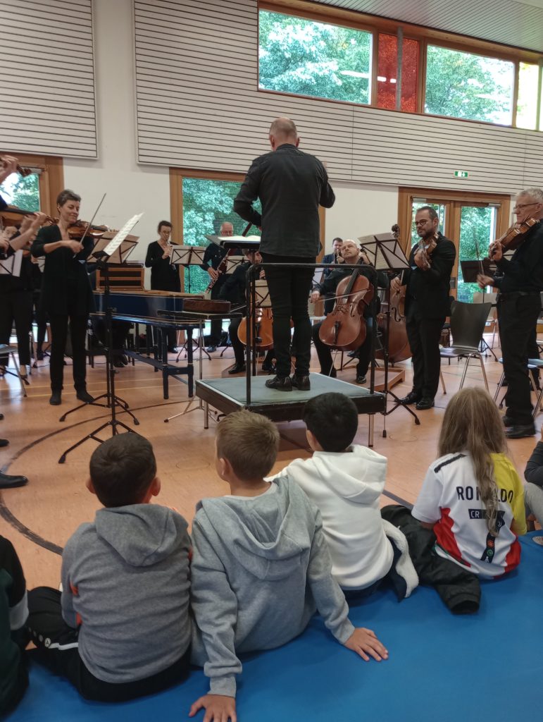 Am 25. September 2025 kam das SWR-Symphonieorchester an die Albert-Schweitzer-Schulen. Gemeinsam mit Kindern der ASS 3 hatten unsere Zweitklässler ein tolles Erlebnis in der Sporthalle. 32 Musikerinnen und Musiker spielten Ausschnitte aus „Les éléments“, stellten ihre Instrumente vor und gaben den Kindern einen Einblick in das Orchesterleben. In interaktiven Momenten konnten die Kinder die Musik miterleben, bekamen Einsätze zum Mitgestalten der Musikinszenierung oder konnten Quizfragen rund um das Orchester beantworten. Es war ein rundum gelungener Nachmittag.
